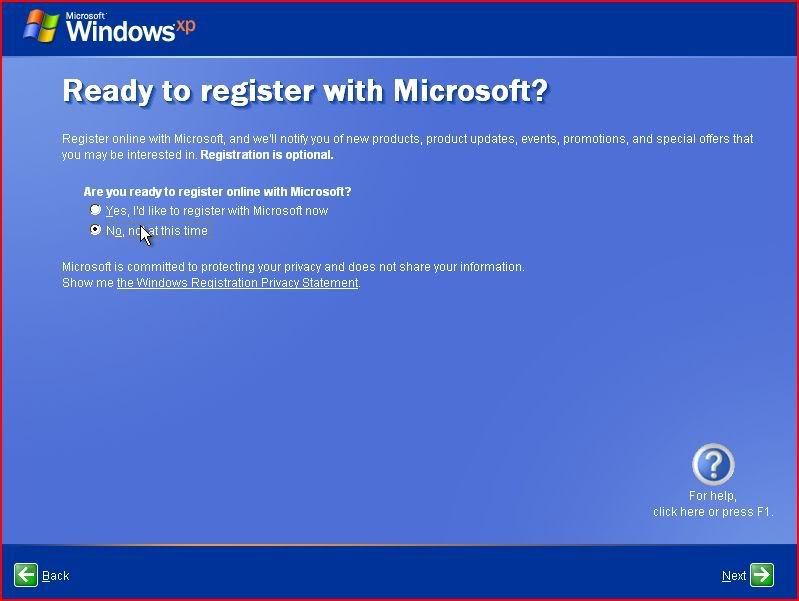 Sau đó là màn hình đăng ký, bạn chọn "No, not at this time" rồi click Next để sang bước kế tiếp